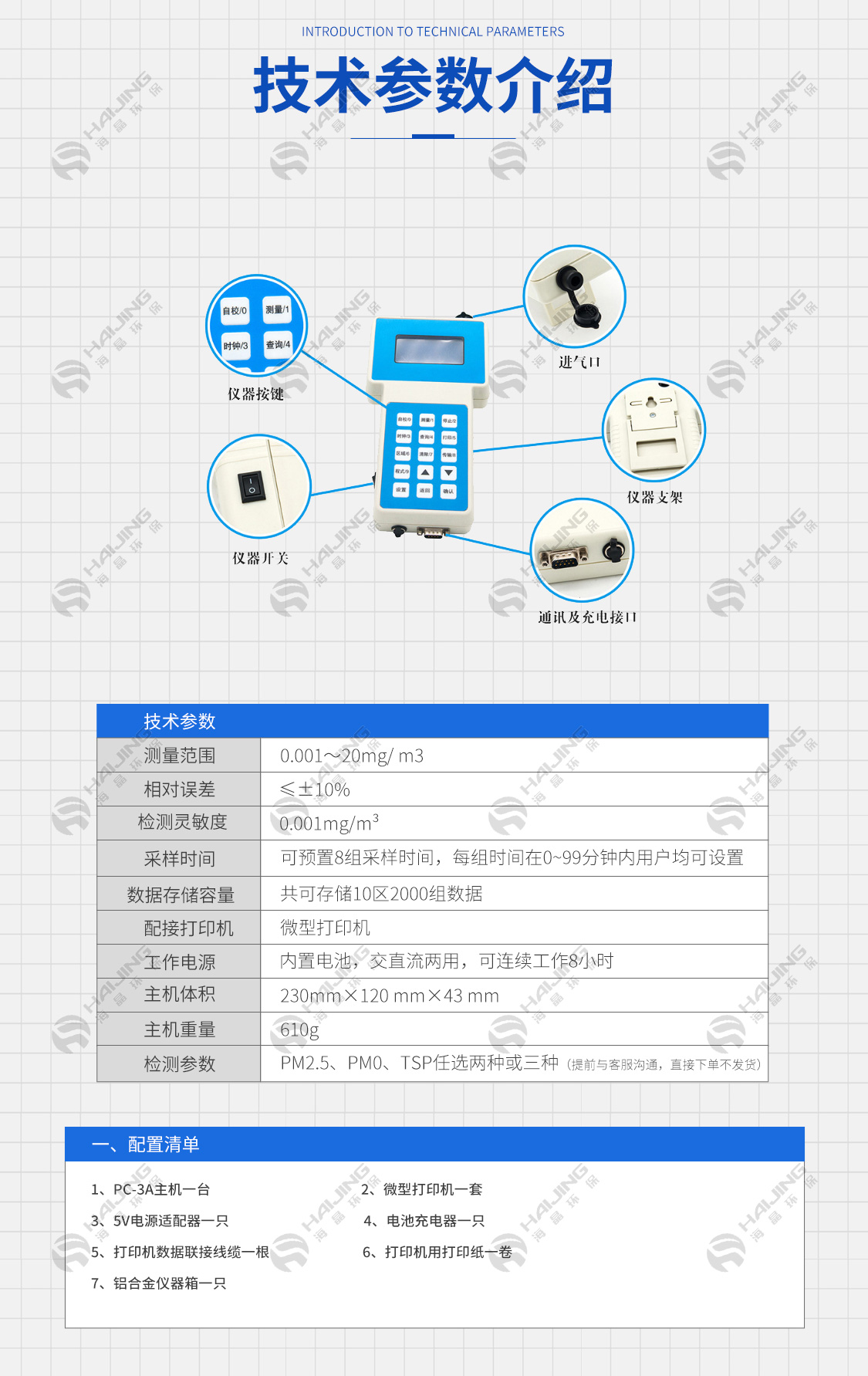 1、可吸入顆粒物測量范圍:0.001~10mg/m3;
