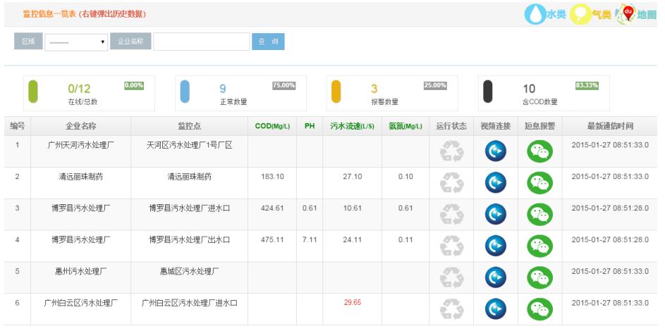 監控數據的主頁面包括在線監控的企業(或監測點)數量,正常排放的監控點數量,有異常報警處理的數量,還有包含監測指標的企業數量。并且顯示各個指標所占的百分比,利于數據分析。下面的表格頁面即顯示了詳細信息:企業的名稱監控點具體描述、監控指標名稱(如COD(mg/l)pH 流量氨氮等),運行狀態是否良好、可視頻鏈接、短信報警、最新通訊的時間幾大部分。每一個都可以詳細查看。如有異常或者超標的數據飄紅,直觀明了。