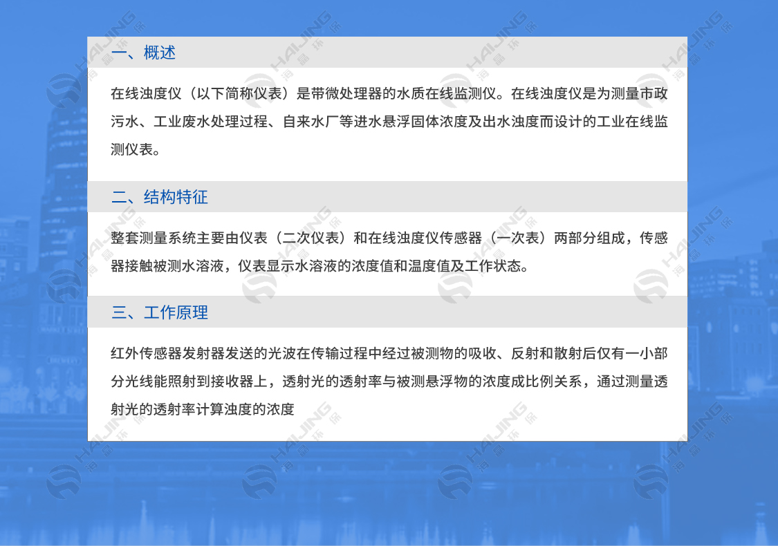 一、典型應(yīng)用 自來水廠中濾池反沖洗水濁度測量、原水及沉淀池出水濁度測量;工業(yè)生產(chǎn)過程、循環(huán)冷...