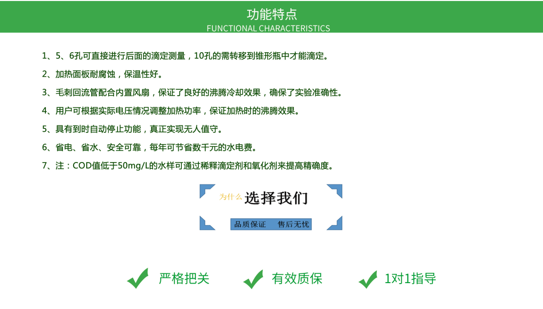 | 產(chǎn)品特點: | 適合日處理量不高的國家單位、第三方檢測使用;由加熱、溫控以及風(fēng)冷三部分構(gòu)成,根據(jù)國標(biāo)法將溫度升至165℃,并保持恒溫2個小時后完成COD消解步驟,確保可靠精確的分析結(jié)果。符合國際標(biāo)準(zhǔn)方法ISO06066-86和國家標(biāo)準(zhǔn)(GB11914-89)的要求...... |