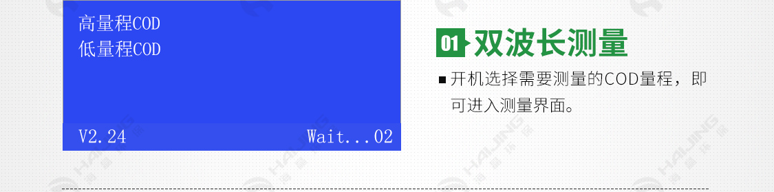 低波長:5 ~ 150 mg/L;高波長:150~10000mg/l(分段測量) |