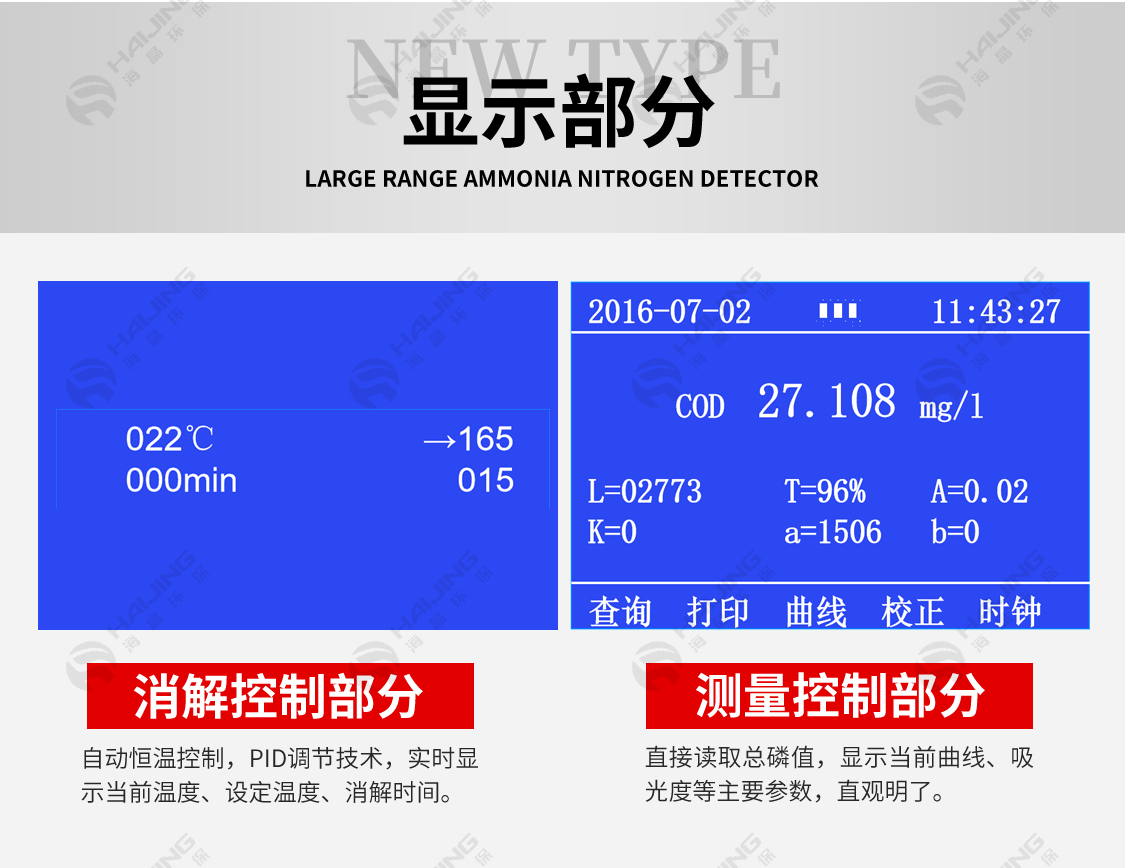 青島海晶環保檢測設備有限公司HJ-30B型便攜式多參數水質檢測儀主要用于現場檢測水中COD、氨氮、總磷、總氮等指標,在符合國標的前提下,將經典的比色法與先進的計算機技術結合起來,應用微電腦光電子比色檢測原理取代傳統的目視比色法,消除了人為誤差,測量分辨率大大提高。該產品具有自動PID控溫、雙液晶顯示、自動調零、濃度直讀、曲線存儲、自動打印等特點,儀器操作簡便,使用者無需復雜的專業知識即可應用本產品。