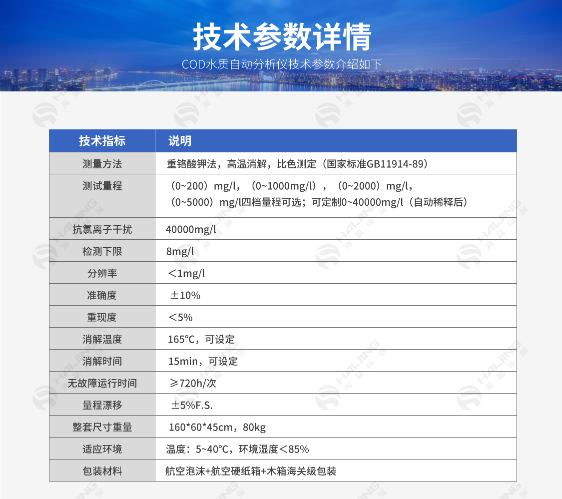 HJCODet-5000型COD在線自動監(jiān)測儀是一款實時監(jiān)控水質(zhì)中化學耗氧量濃度的智能化、自動化儀器。該儀器基于快速消解分光比色法檢測COD的原理,將檢測過程自動化,大大節(jié)約了人力物力,檢測結(jié)果快速、準確,適合企業(yè)污水進/出口、各種水源地以及工業(yè)生產(chǎn)過程中對水中COD含量的監(jiān)控。儀器可上傳數(shù)據(jù)至控制室,方便實驗人員實時查看。