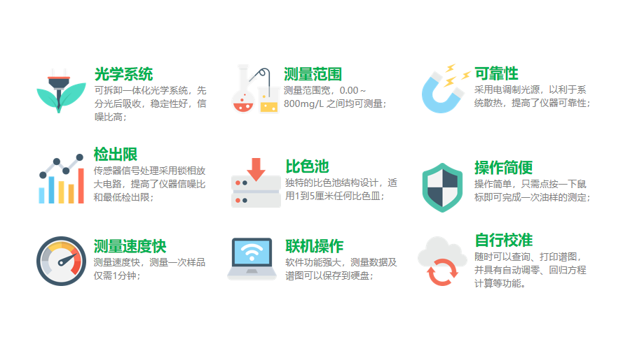 四、主要應用領域:紅外測油儀不僅適用于地表水、地下水、海水、生活用水和工業廢水等各種水體及土壤中石油類(礦物油)、動植物油及總油含量的監測,同時也是煙氣(飲食行業油煙)含油量監測國家標準推薦的儀器。此外,還可用于有機試劑純度檢測及含各種不同C-H鍵有機物總量和分量的測量。