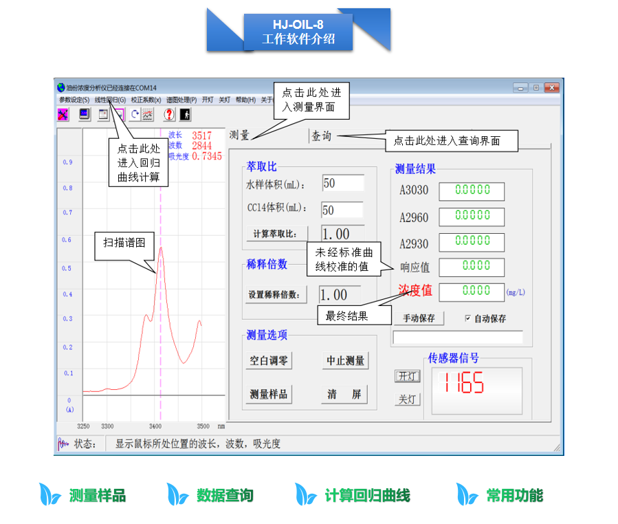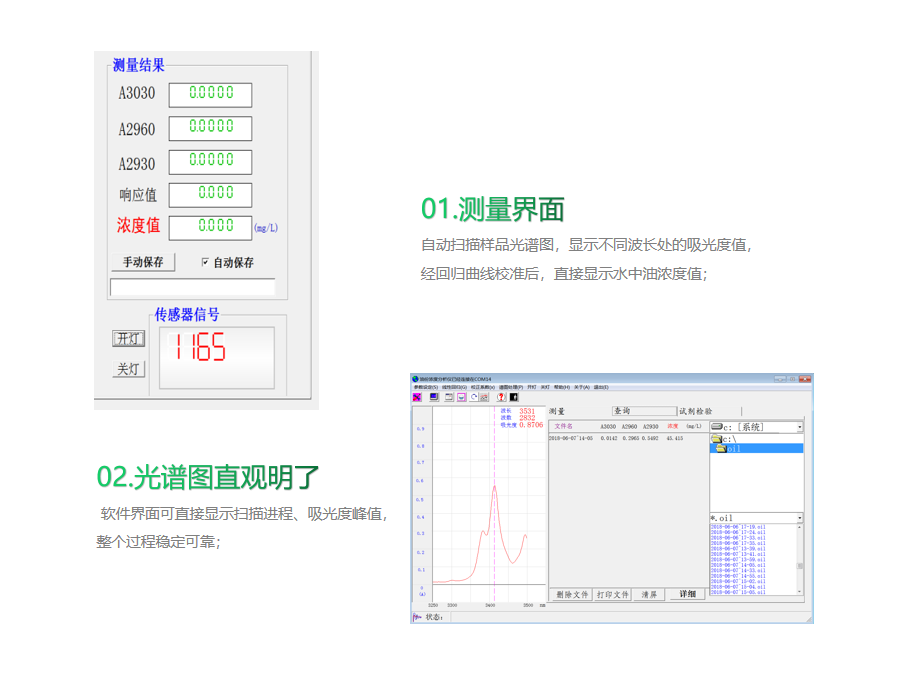 一、儀器原理: 傳統的成分分析先取樣再以定性方式量測,時間長且無法及時得到測量數據。而大多數物質的分子官能基能吸收紅外光,利用光譜能量的吸收與轉換很容易進行內部成分的定性分析和定量計算。紅外測油儀正是以此為基本原理,采用紅外分光光度測量,經對樣品進行光譜掃描,可顯示并打印樣品光譜及吸收峰的波數位置,能迅速、準確地測出水體中油份濃度的全部含量。測定程序符合“